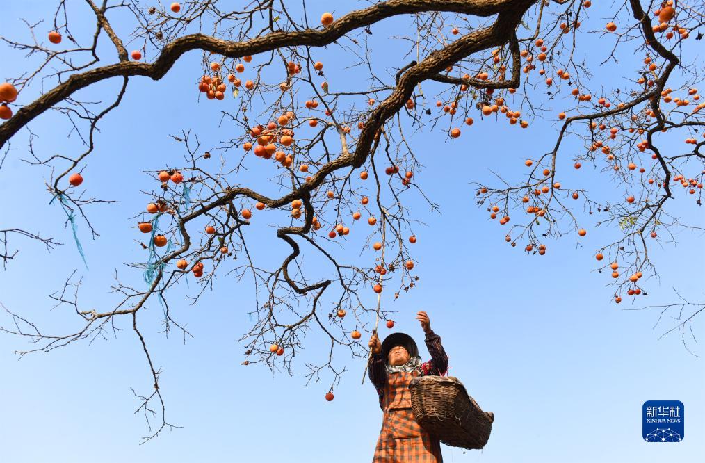 10月24日,山东省淄博市沂源县石桥镇分水新村的农民在采收柿子。新华社发(赵东山 摄)