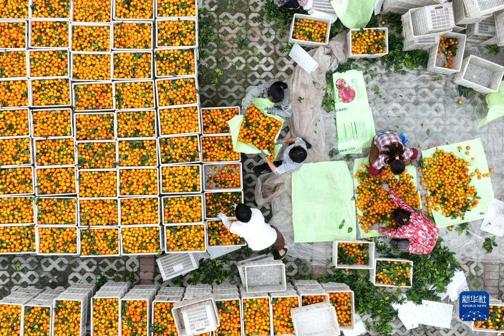 10月24日,四川省广安市武胜县龙女镇青岩村果农在挑选砂糖桔装框(无人机照片)。新华社发(夏俊林 摄)