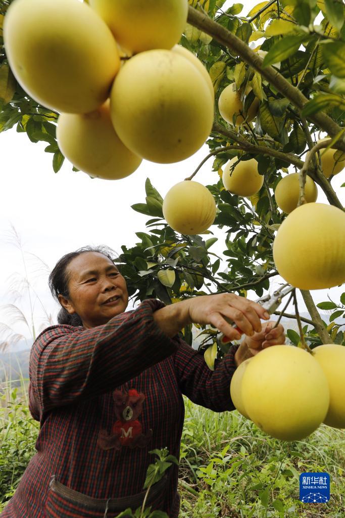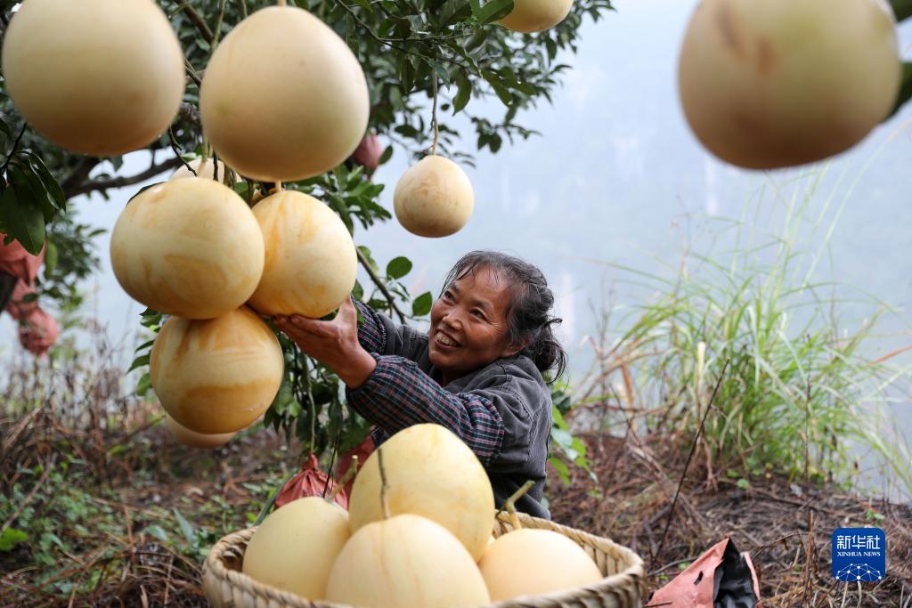 10月26日,村民在贵州省开阳县花梨镇清江村蜜柚种植基地里采摘柚子。新华社发(袁福洪 摄)