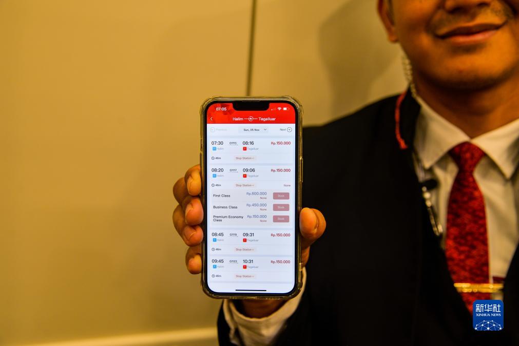 11月5日,一名乘务人员在行驶中的雅万高铁高速动车组列车车厢内展示雅万高铁购票手机应用,当日部分车次车票已售罄。新华社记者 徐钦 摄