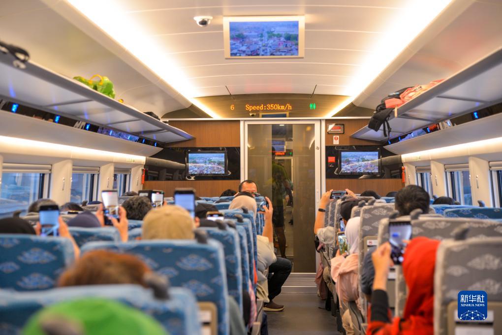 11月5日,乘客纷纷用手机在行驶中的雅万高铁高速动车组列车车厢内拍摄显示列车时速达到350公里的电子屏。新华社记者 徐钦 摄