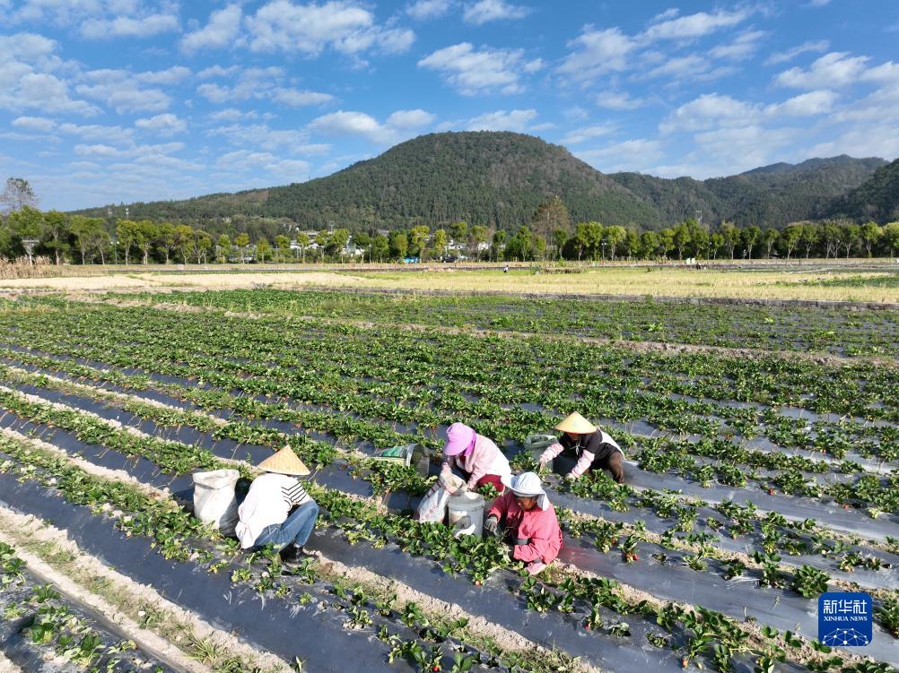 11月7日,在云南省腾冲市和顺镇,农民在田间管护草莓苗(无人机照片)。新华社发(龚祖金摄)