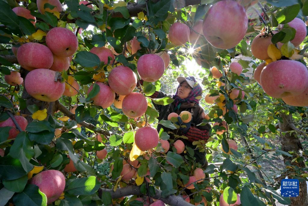 11月7日,在河北省滦州市王店子镇卧龙谷生态农业科技园区,果农在采摘苹果。新华社发(董军摄)