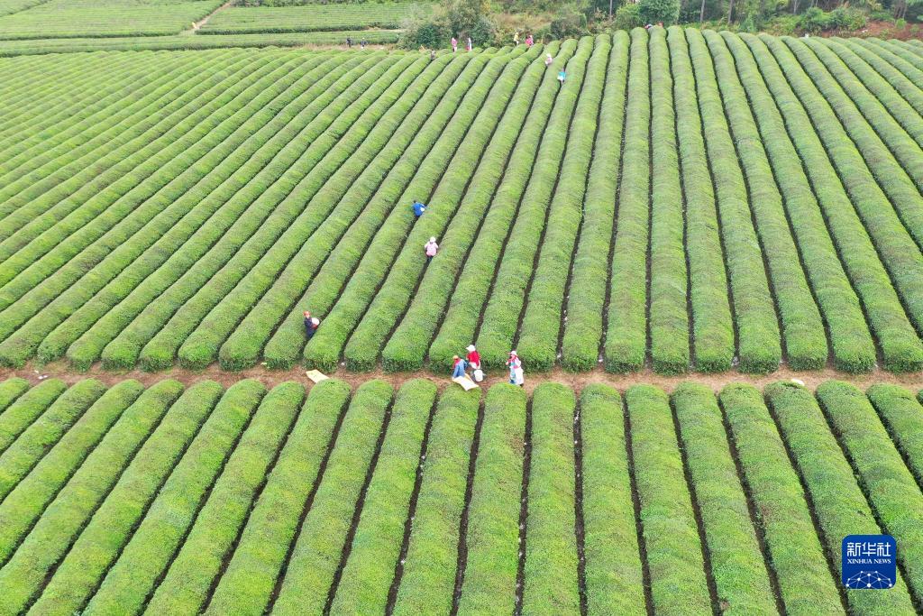11月7日,在江西省抚州市金溪县华侨管理区枫山茶场,茶农给茶树施肥、除草(无人机照片)。新华社发(邓兴东摄)