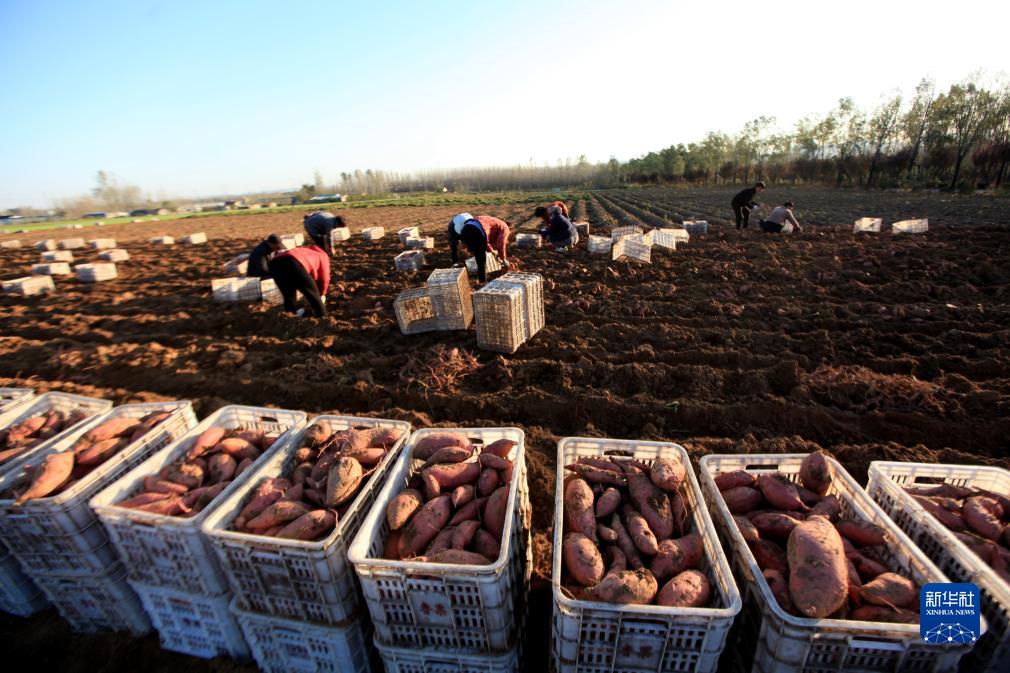 11月7日,在山东省临沂市平邑县地方镇黄城村,农民在田间收获晚茬红薯。新华社发(武纪全摄)
