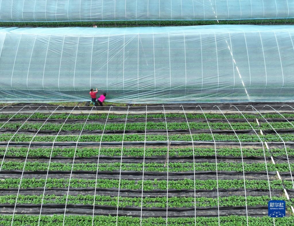 11月7日,在湖南省永州市道县寿雁镇永丰村,农民在覆盖草莓大棚薄膜(无人机照片)。新华社发(蒋克青摄)