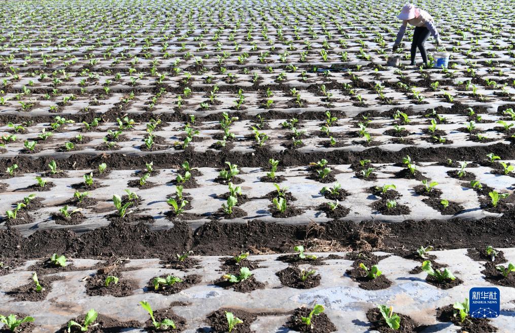 11月7日,在云南省丽江市玉龙县黄山街道长水社区,农民给菜苗浇水。新华社发(赵庆祖摄)