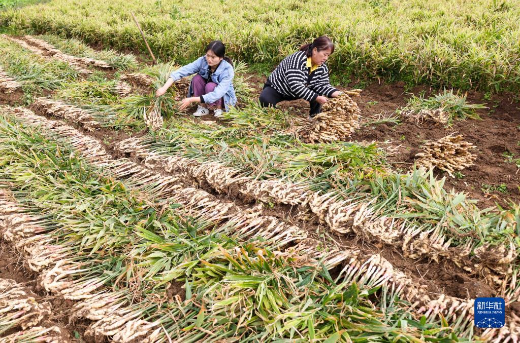 11月7日,在贵州省铜仁市玉屏侗族自治县平溪街道马头田村,农民在田间收获生姜。新华社发(胡攀学摄)