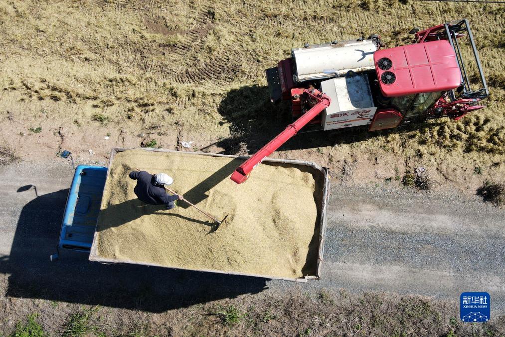 11月7日,在安徽省芜湖市繁昌区荻港镇,村民将收割的水稻装车(无人机照片)。新华社记者 黄博涵 摄