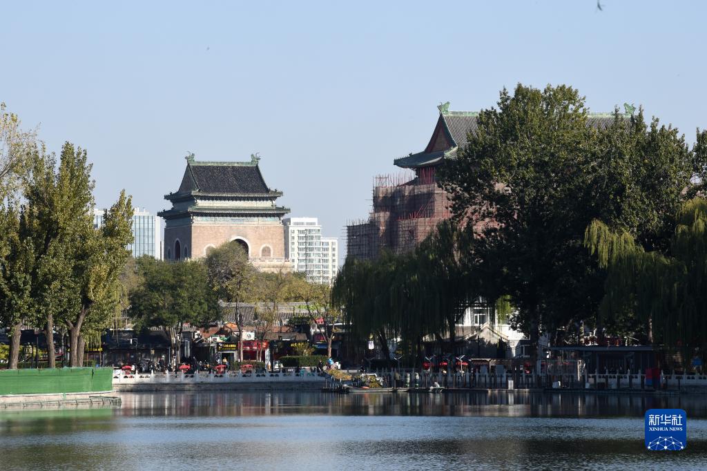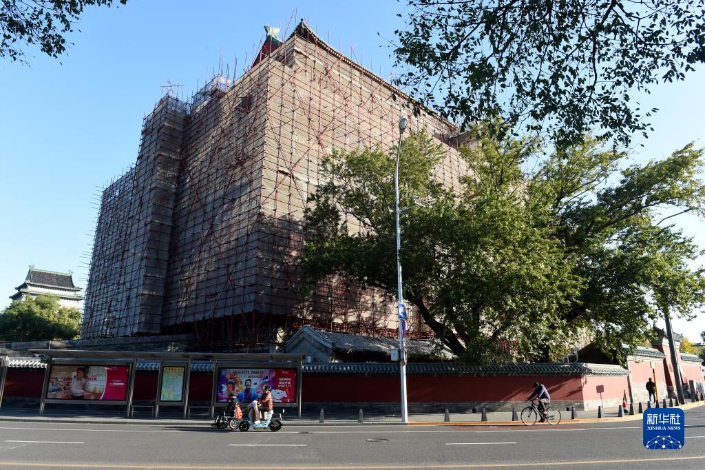 从景山上向北眺望可以看到正在修缮的鼓楼(10月19日摄)。新华社记者 李鑫 摄