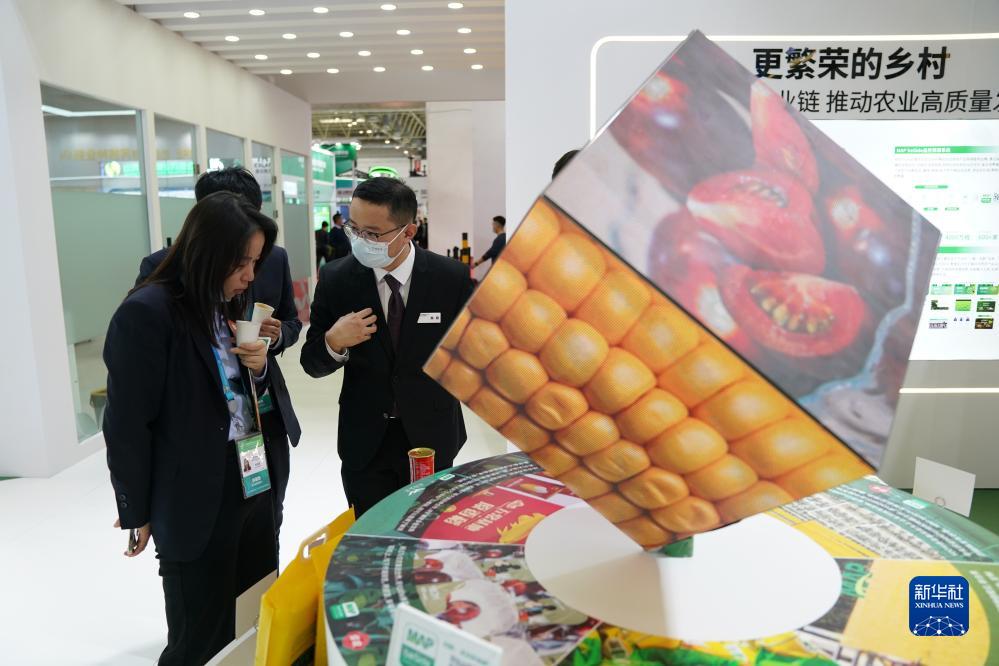11月28日,参会人员(左一)在先正达集团展台咨询。新华社记者 彭子洋 摄
