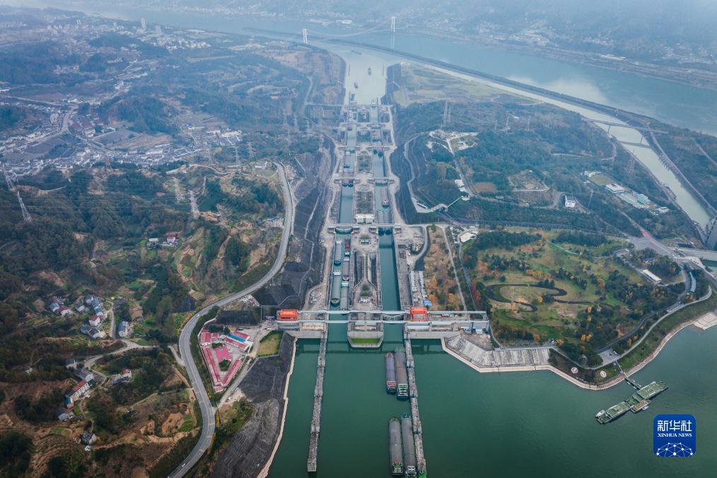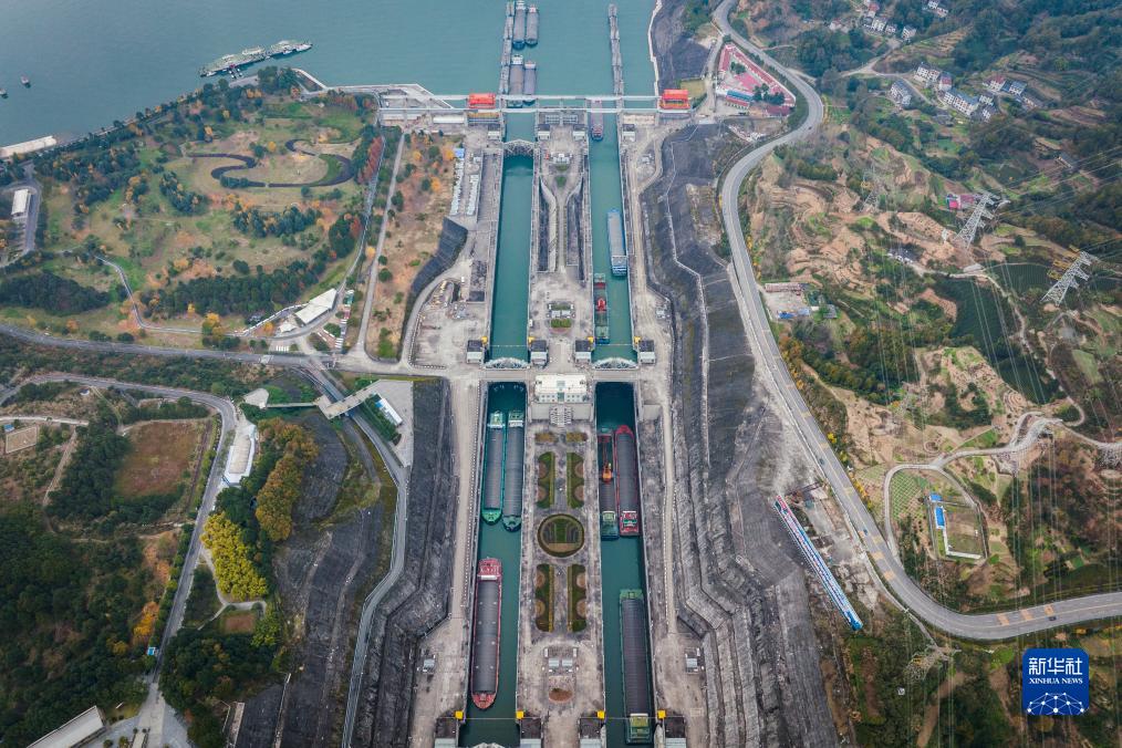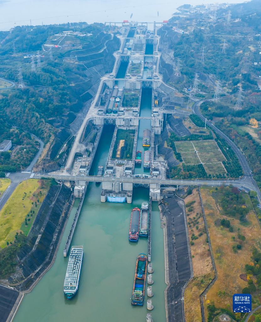 12月1日,船舶有序通过三峡双线五级船闸(无人机照片)。新华社发(郑家裕摄)