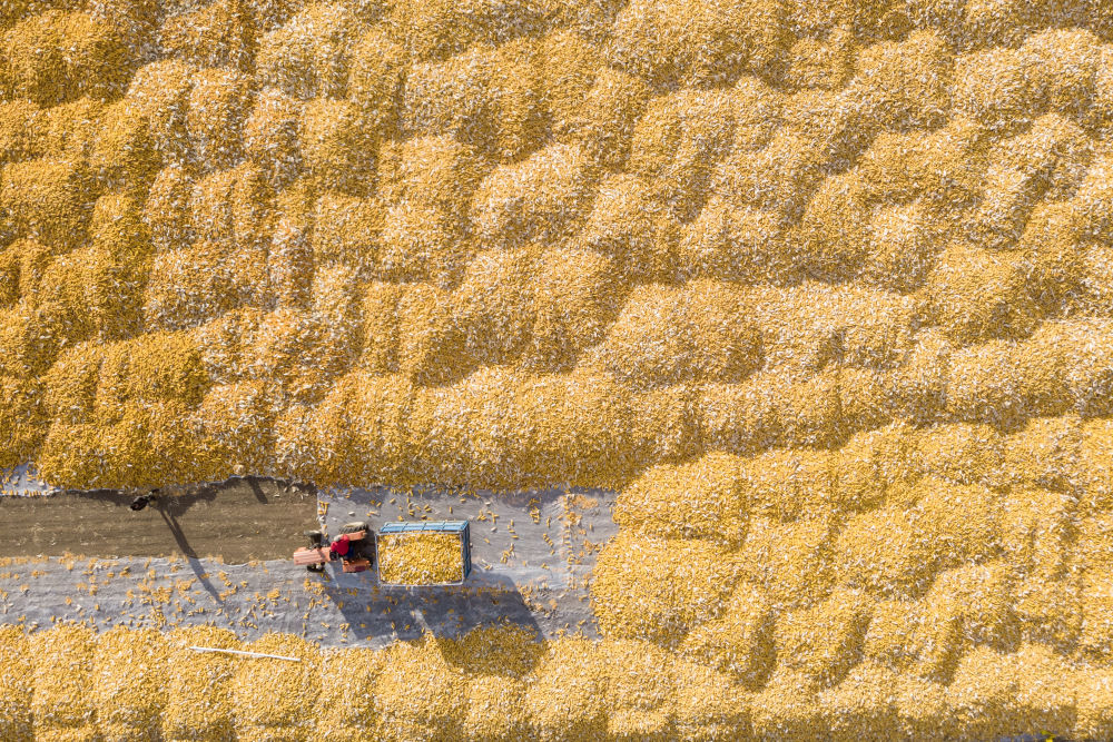 2023年10月19日,在黑龙江省肇东市五里明镇东升村,农民把收获的玉米运到当地农业合作社指定的地点进行晾晒(无人机照片)。新华社记者 谢剑飞 摄
