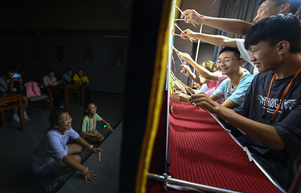 2023年8月8日,进行暑期研学的学生在位于陕西省西安市的中国秦腔艺术博物馆体验皮影戏演出。新华社记者 邹竞一 摄