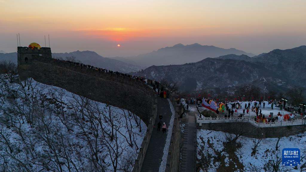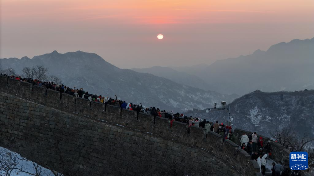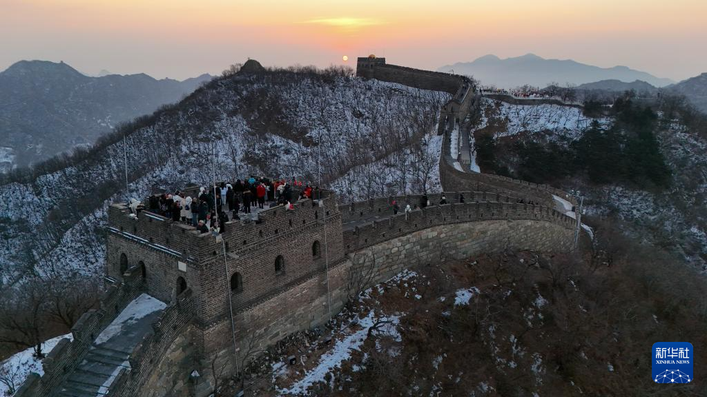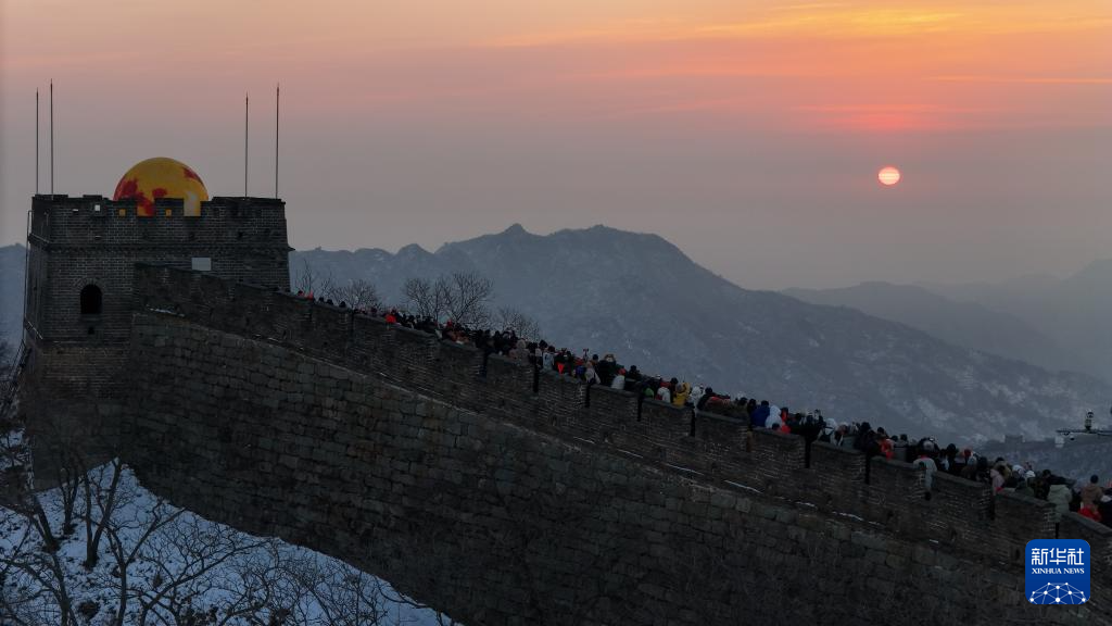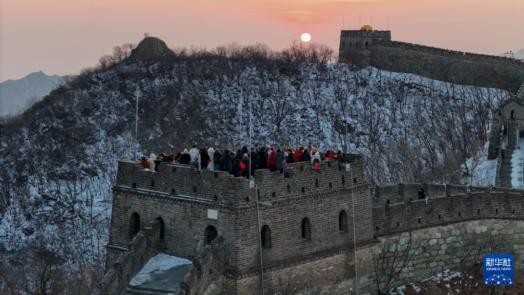 1月1日,游客在北京慕田峪长城景区观看新年日出(无人机照片)。当日,北京慕田峪长城景区举办第30届长城观日出活动。新华社记者 鞠焕宗 摄