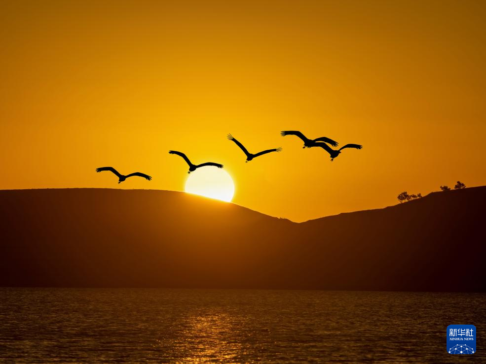 1月1日,在云南省昭通市大山包黑颈鹤国家级自然保护区,国家一级保护动物黑颈鹤正迎着新年的第一缕晨光自由飞翔。新华社发(曾三东 摄)