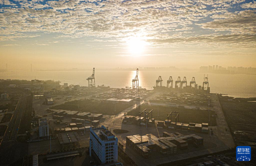 这是1月1日在海南自贸港重点园区——洋浦经济开发区拍摄的晨光(无人机照片)。新华社记者 蒲晓旭 摄