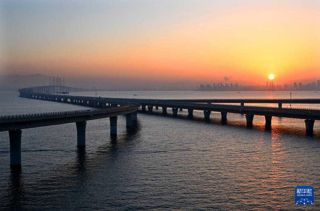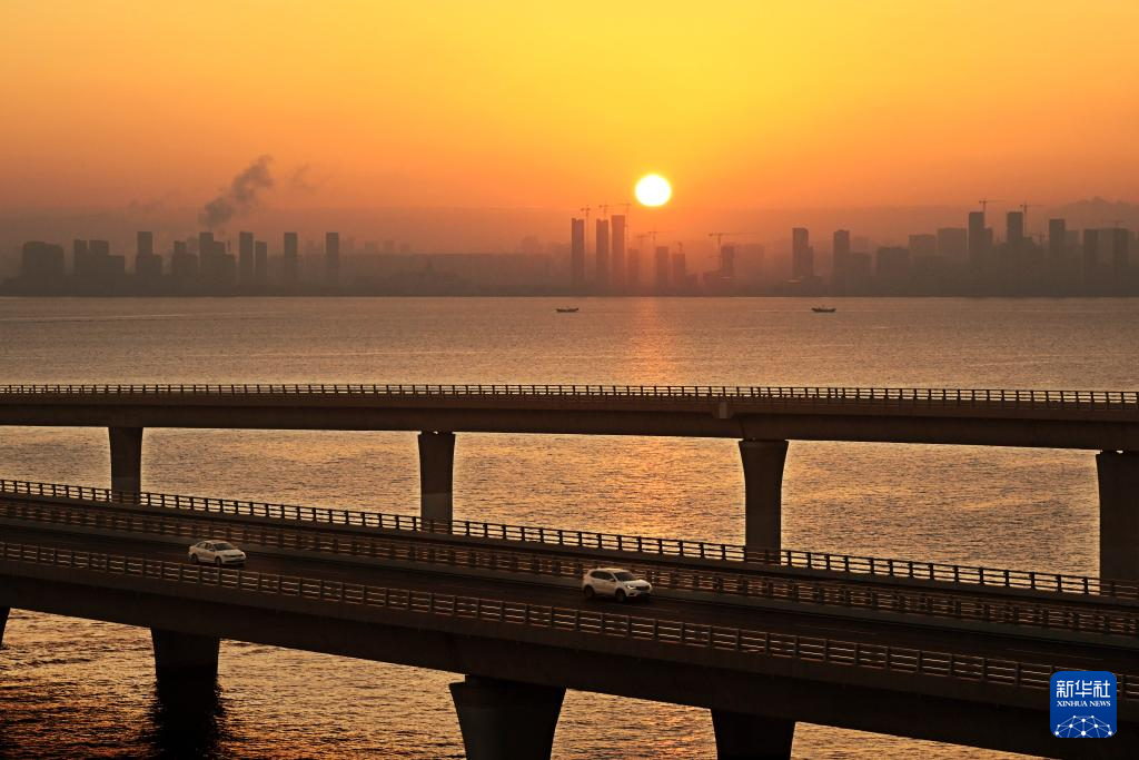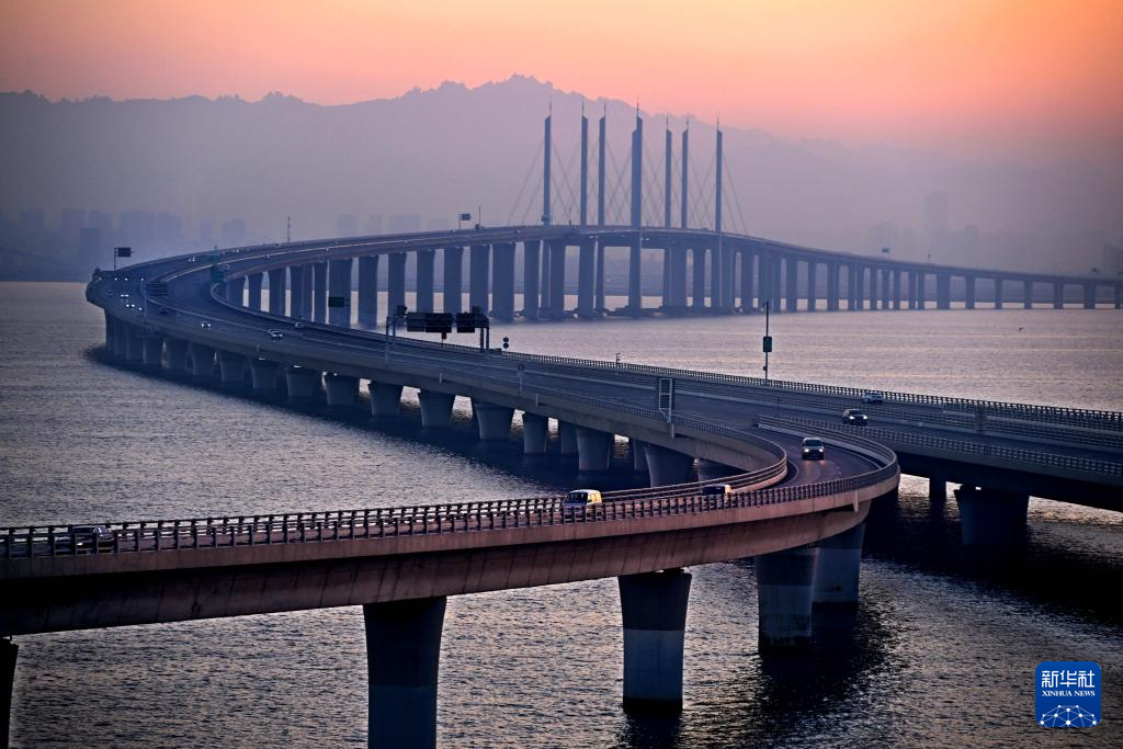 1月1日,车辆在新年第一缕晨光中从山东青岛胶州湾跨海大桥上驶过。新华社记者 李紫恒 摄
