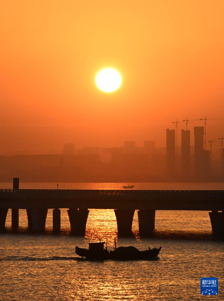 1月1日,一条渔船在新年第一缕晨光中从山东青岛胶州湾跨海大桥旁驶过。新华社记者 李紫恒 摄