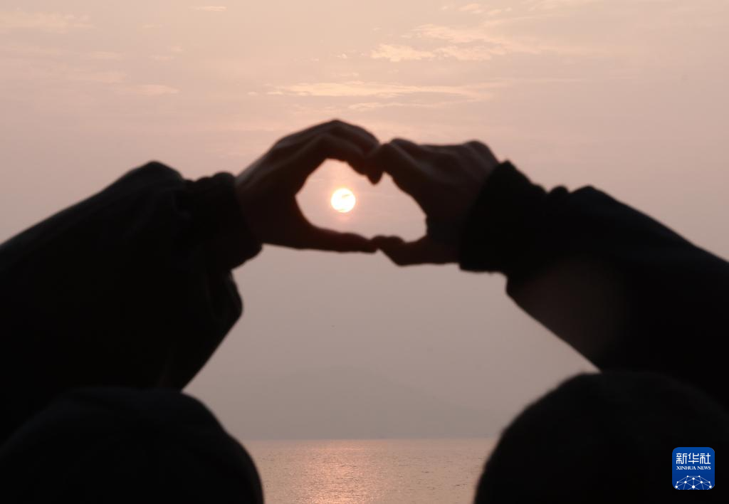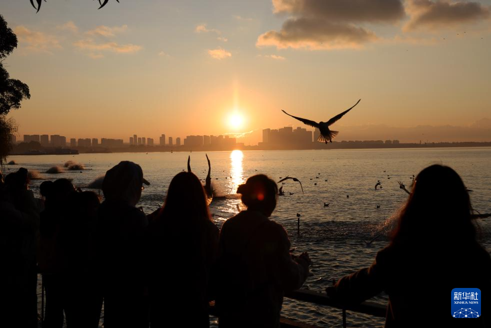 1月1日,在云南省昆明市西山区滇池,人们在观赏新年第一天的日出。新华社发(张正举 摄)