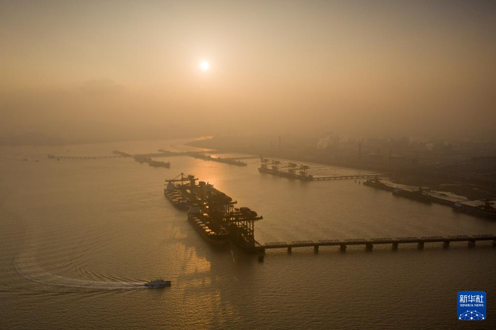 1月1日,在新年第一缕晨光里,浙江省宁波舟山港北仑港区矿石码头生产一派繁忙(无人机照片)。新华社发(蒋晓东 摄)