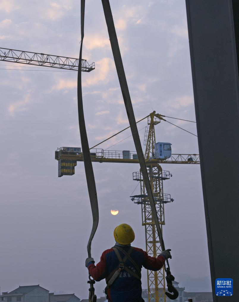 1月1日,映着朝阳,工人在浙江省杭温高铁台州市仙居站项目施工现场进行施工作业。新华社发(王华斌 摄)