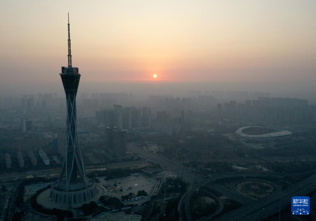 这是1月1日在河南省郑州市中原福塔附近拍摄的日出(无人机照片)。新华社记者 李嘉南 摄
