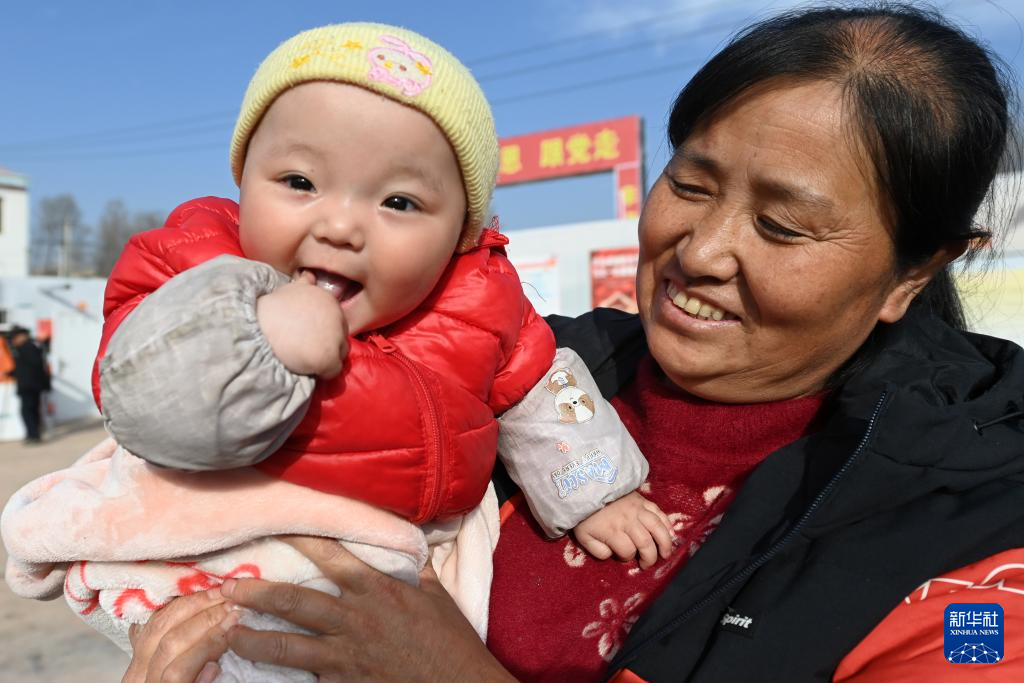 1月1日,在甘肃省积石山县刘集乡团结村安置点,村民抱着小孩在板房外晒太阳。新华社记者 范培珅 摄