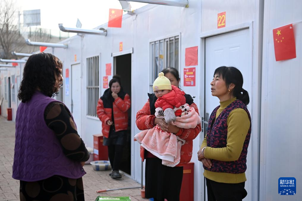 1月1日,在甘肃省积石山县刘集乡团结村安置点,村民在板房外聊天。新华社记者 范培珅 摄