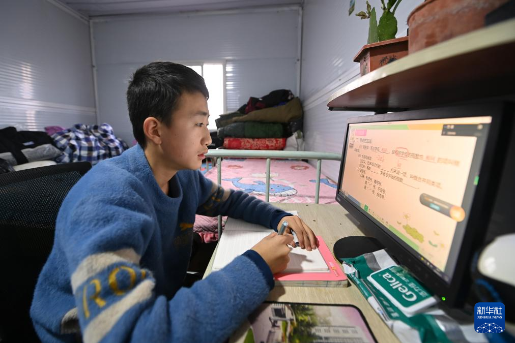 1月1日,在甘肃省积石山县石塬镇沈家坪村安置点,学生薛君伟在板房内上网课。新华社记者 范培珅 摄