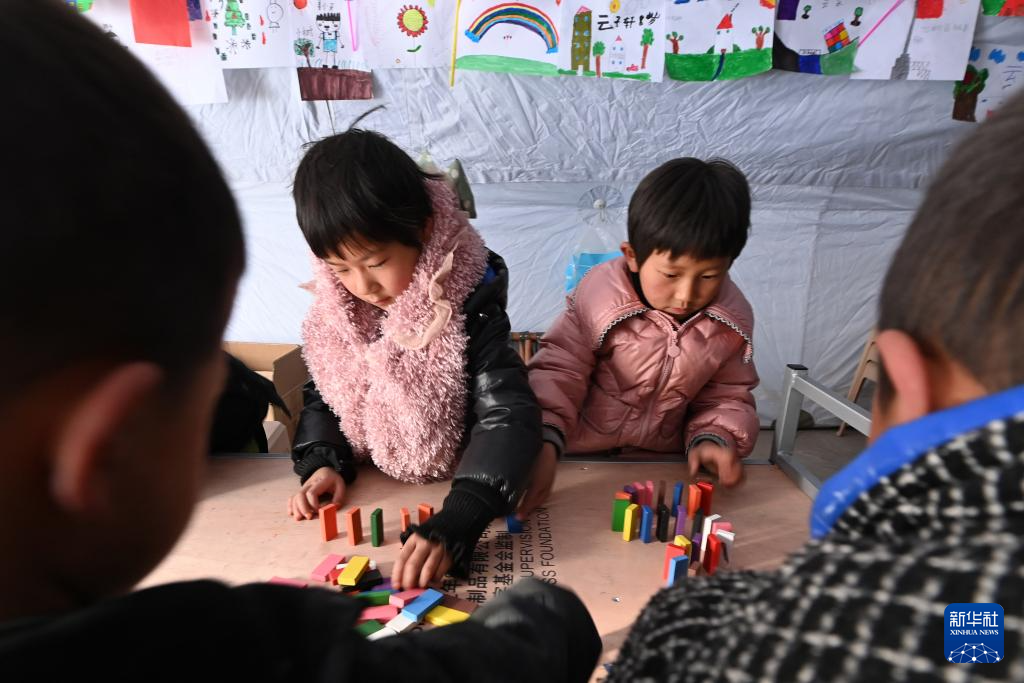 1月1日,孩子们在甘肃省积石山县大河家镇克新民村安置点玩耍。新华社记者 范培珅 摄