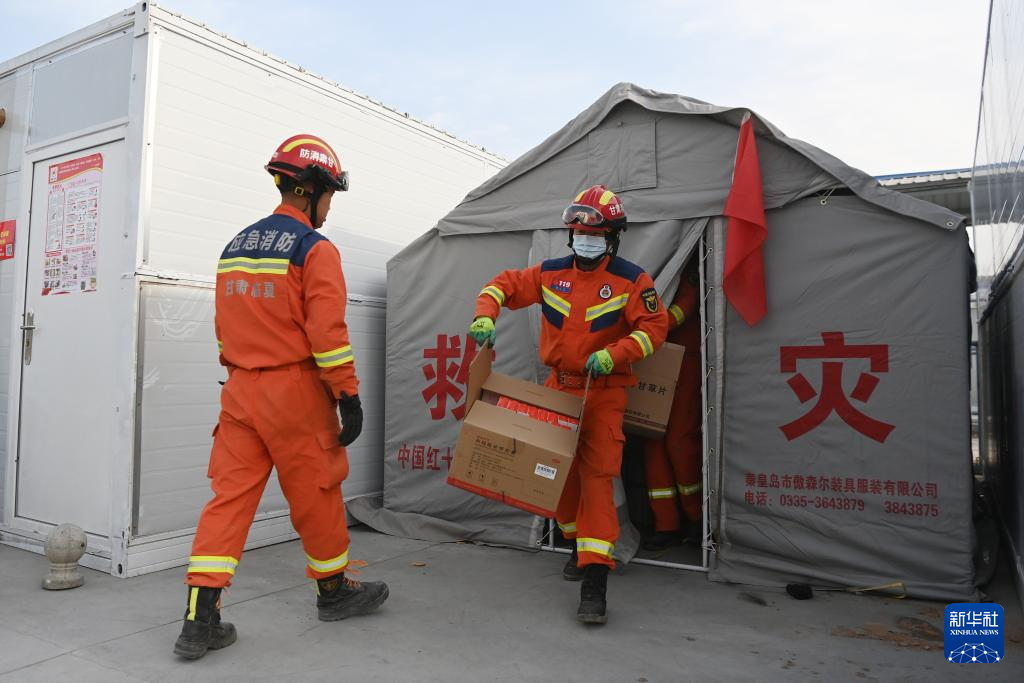 1月1日,在甘肃省积石山县大河家镇克新民村安置点,甘肃省消防救援总队临夏消防救援支队消防员帮安置点卫生室搬运药物。新华社记者 范培珅 摄