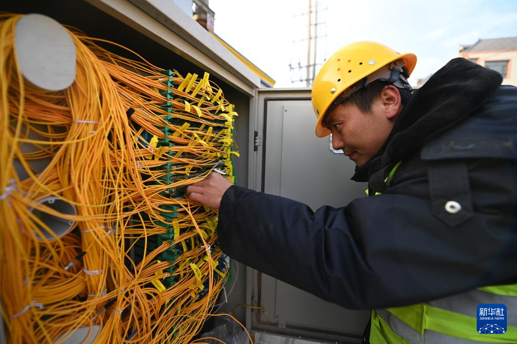 1月1日,在甘肃省积石山县大河家镇大河村安置点,运维人员维护安置点光纤网络。新华社记者 范培珅 摄