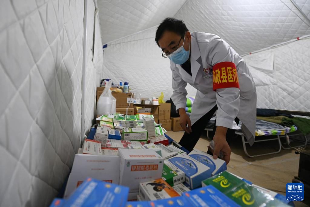 1月1日,在甘肃省积石山县石塬镇沈家坪村安置点医疗点,和政县医疗队队员王明理整理安置点常备药物。新华社记者 范培珅 摄