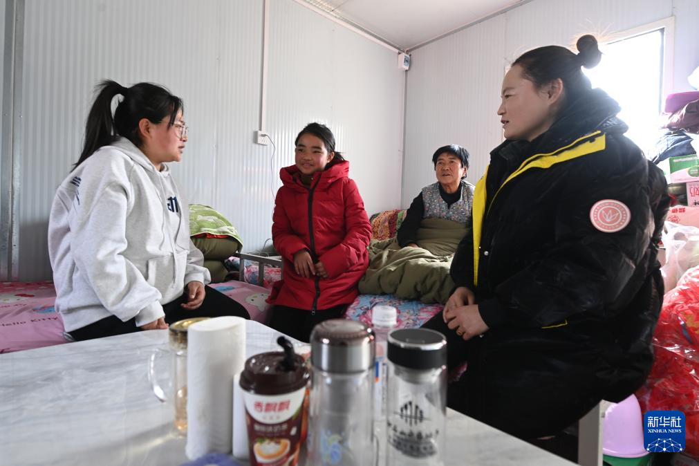 1月1日,在甘肃省积石山县大河家镇克新民村安置点,包村干部董汛(左一)与受灾群众交流。新华社记者 范培珅 摄