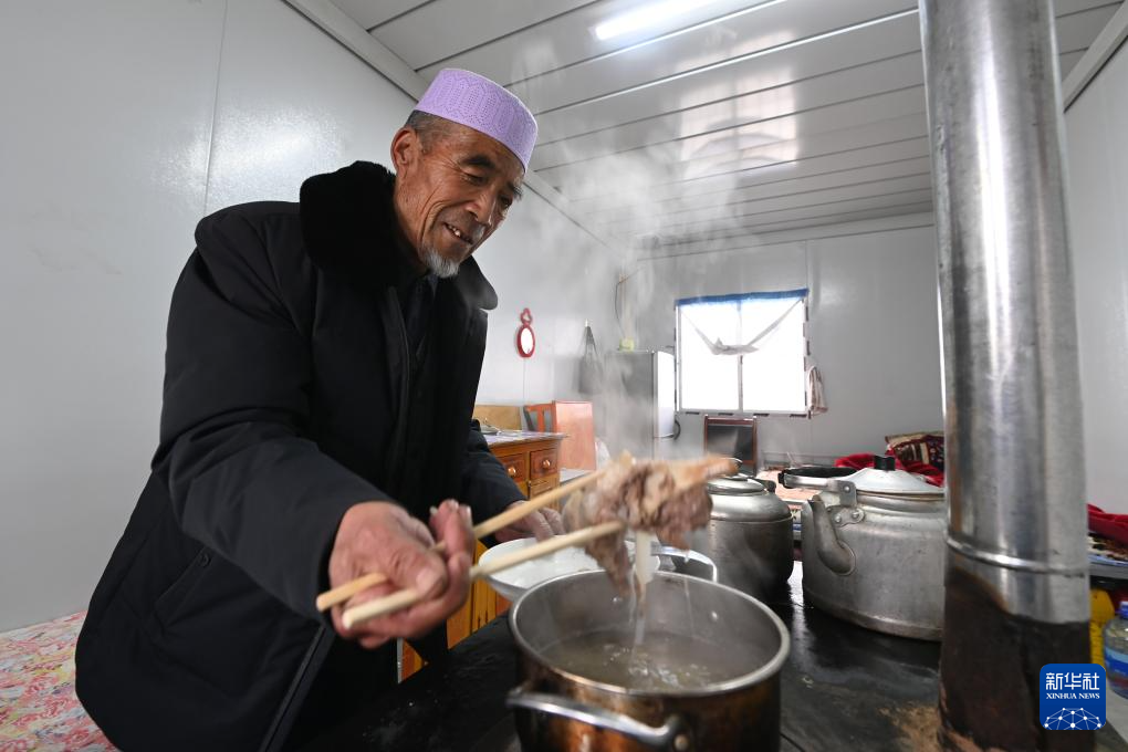 1月1日,在甘肃省积石山县大河家镇克新民村安置点,村民从锅中捞出煮好的手抓羊肉。新华社记者 范培珅 摄