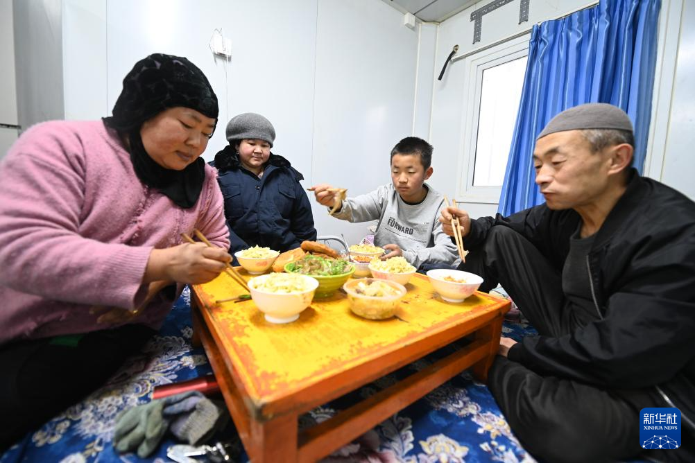 1月1日,在甘肃省积石山县大河家镇大河村安置点,村民在板房内吃饭。新华社记者 范培珅 摄