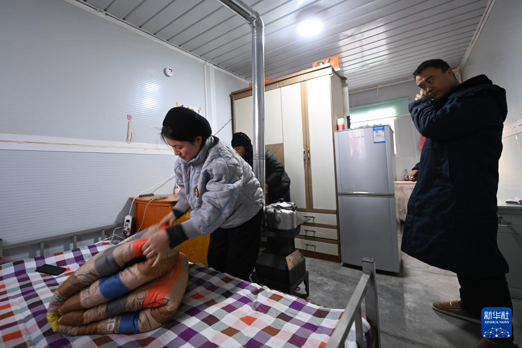 1月1日,在甘肃省积石山县大河家镇大河村安置点,村民在板房内整理被褥。新华社记者 范培珅 摄
