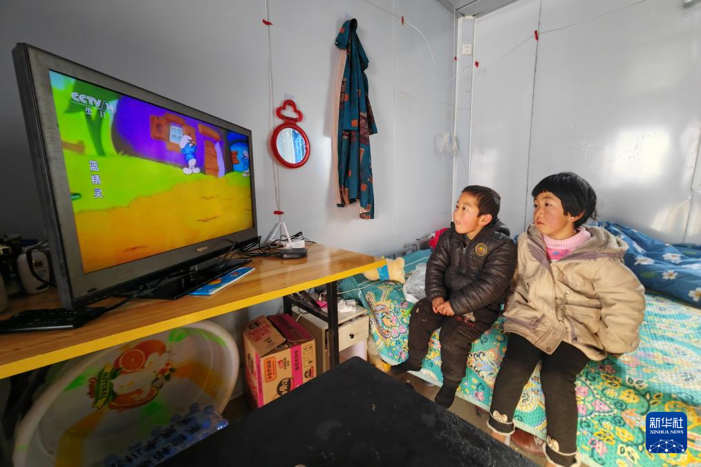1月1日,在甘肃省积石山县柳沟乡斜套村安置点,小朋友在板房内看动画片。新华社记者 范培珅 摄