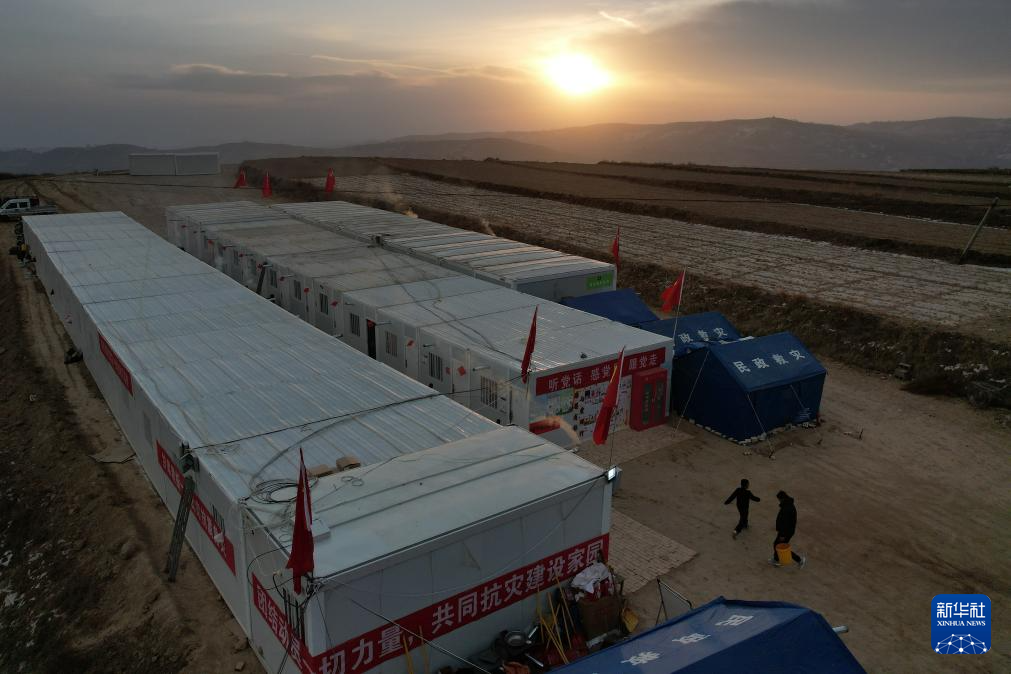 这是1月1日在甘肃省积石山县石塬镇拍摄的沈家坪村安置点清晨景象(无人机照片)。新华社记者 范培珅 摄