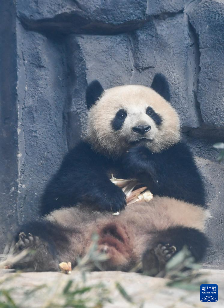 1月3日,大熊猫“巧月”在重庆永川乐和乐都动物主题乐园熊猫馆吃竹笋。新华社记者 王全超 摄