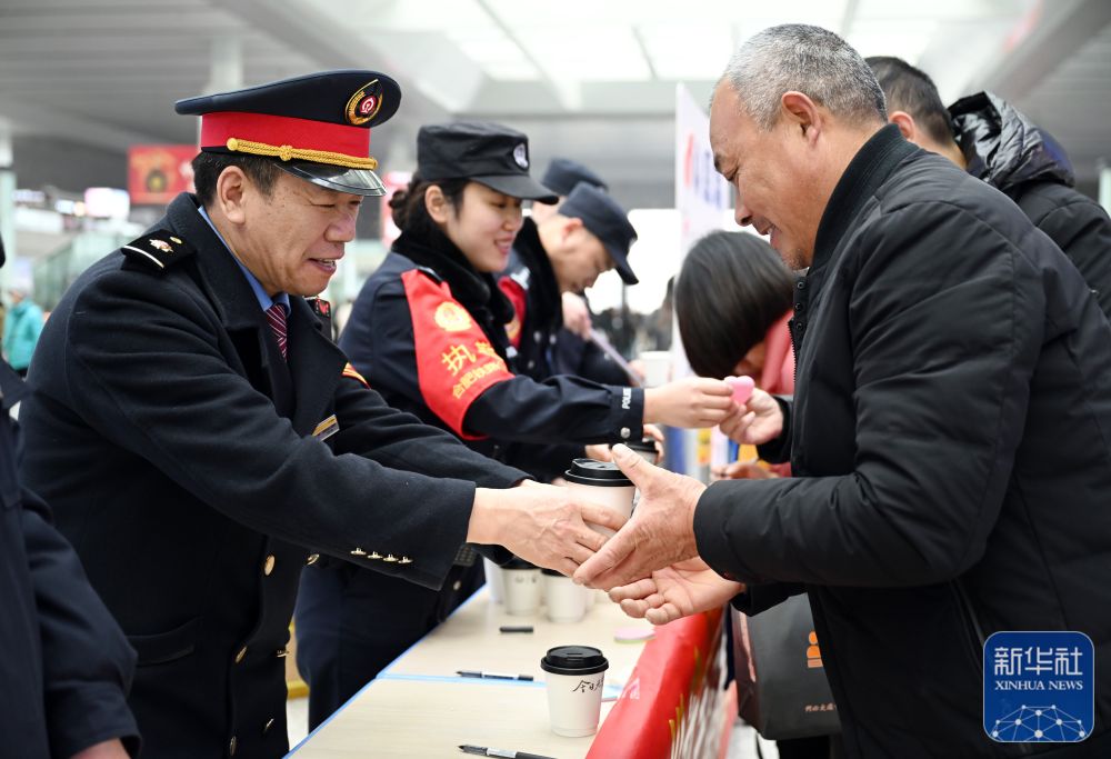 1月8日,合肥铁路公安处民警和车站工作人员在合肥南站候车室向旅客赠送姜茶。