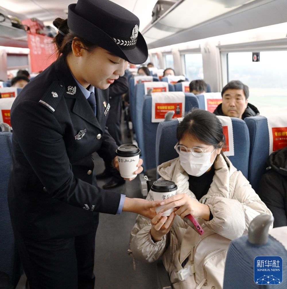 1月8日,合肥铁路公安处乘警支队民警在G8323次列车上向旅客赠送姜茶。