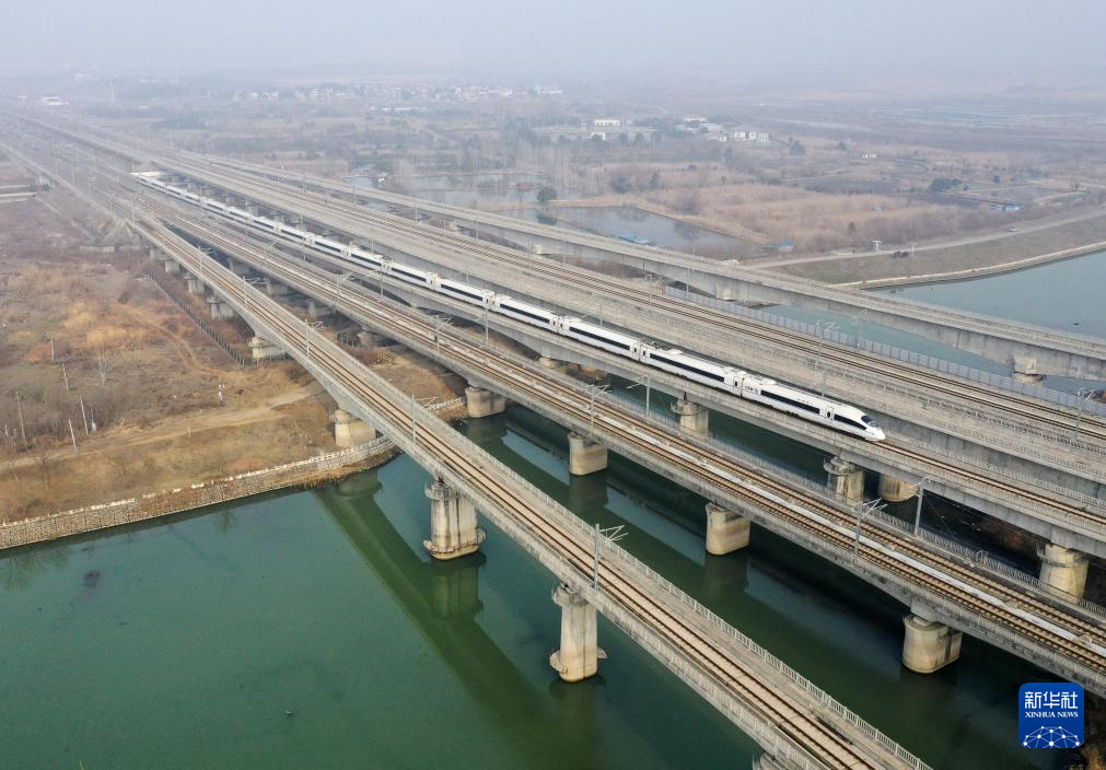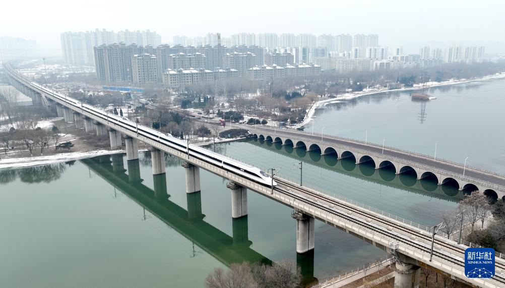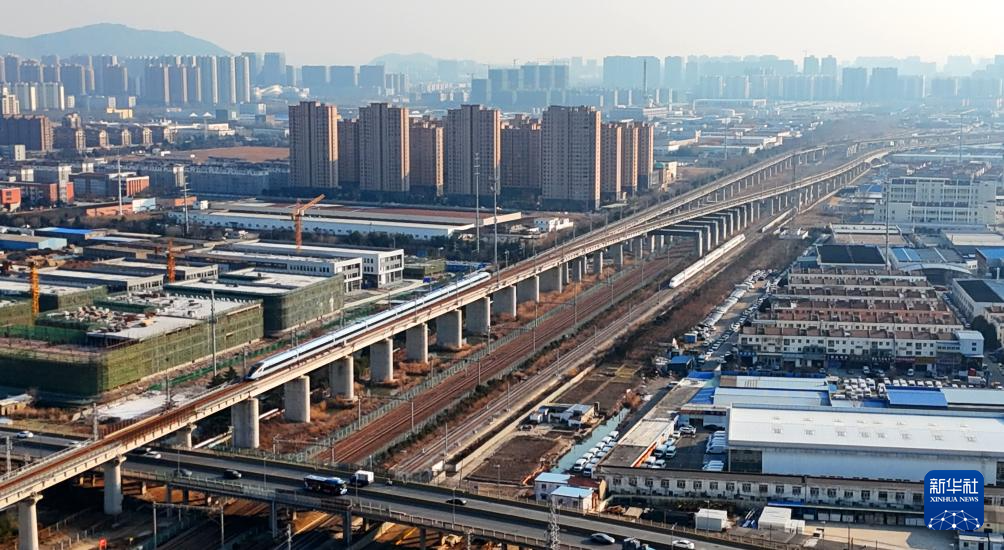 1月9日,一列动车组列车在河北省石家庄市境内行驶(无人机照片)。新华社发(梁子栋 摄)