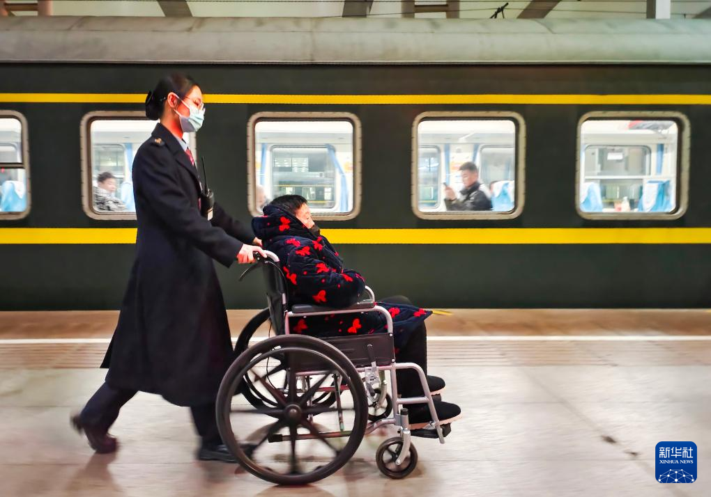 1月8日,湖北省武昌火车站志愿者帮助一名乘客换乘。新华社发(胡学军 摄)