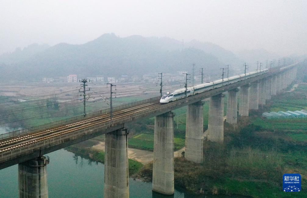 1月9日,一列动车组在贵阳市开阳县顶方村境内行驶(无人机照片)。新华社发(袁福洪 摄)