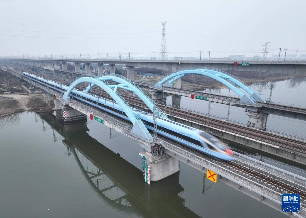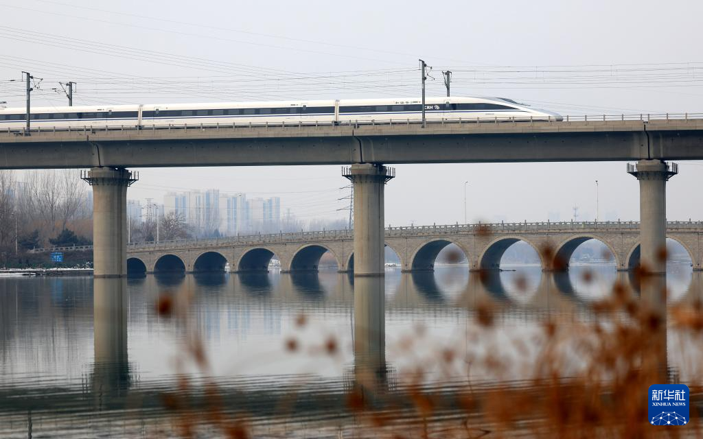 1月9日,列车驶过江苏省连云港市海州区境内的一座铁路桥(无人机照片)。新华社发(王春摄)