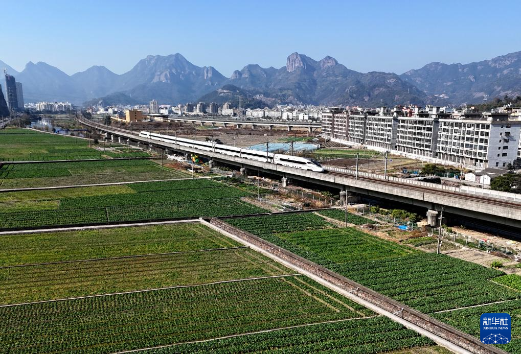 1月9日,动车组列车行驶在浙江省乐清市境内(无人机照片)。新华社发(蔡宽元 摄)