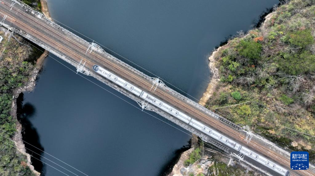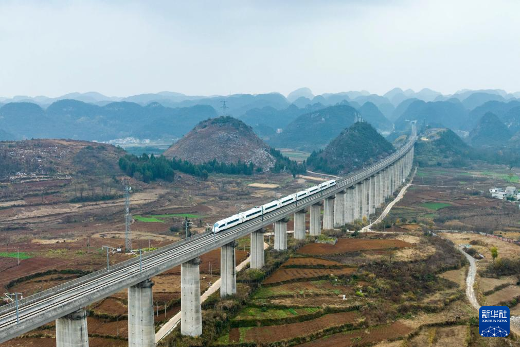 1月9日,一列动车组列车行驶在沪昆高铁贵州省安顺市镇宁布依族苗族自治县境内(无人机照片)。新华社发(陈熙 摄)