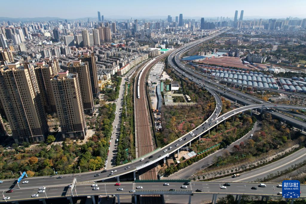 1月9日,动车组列车行驶在云南省昆明市境内(无人机照片)。新华社发(张正举摄)